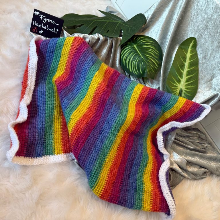 Diese Babydecke ist ein ganz besonderes Projekt für mich. In etwa einer Woche ist sie Stück für Stück gewachsen – mit viel Geduld, Herz und jeder Menge Farbe. Gehäkelt habe ich sie in tunesischer Häkeltechnik, die der Decke ihre ganz eigene Struktur und einen wunderschönen, gewebten Look verleiht. Die sanften Farbverläufe im Regenbogenstil machen sie nicht nur zu einem echten Hingucker, sondern auch zu einem Symbol für Hoffnung, Liebe und Wärme – besonders schön als Geschenk zur Geburt oder einfach als liebevolle Kuscheldecke für kleine und große Lieblingsmenschen.